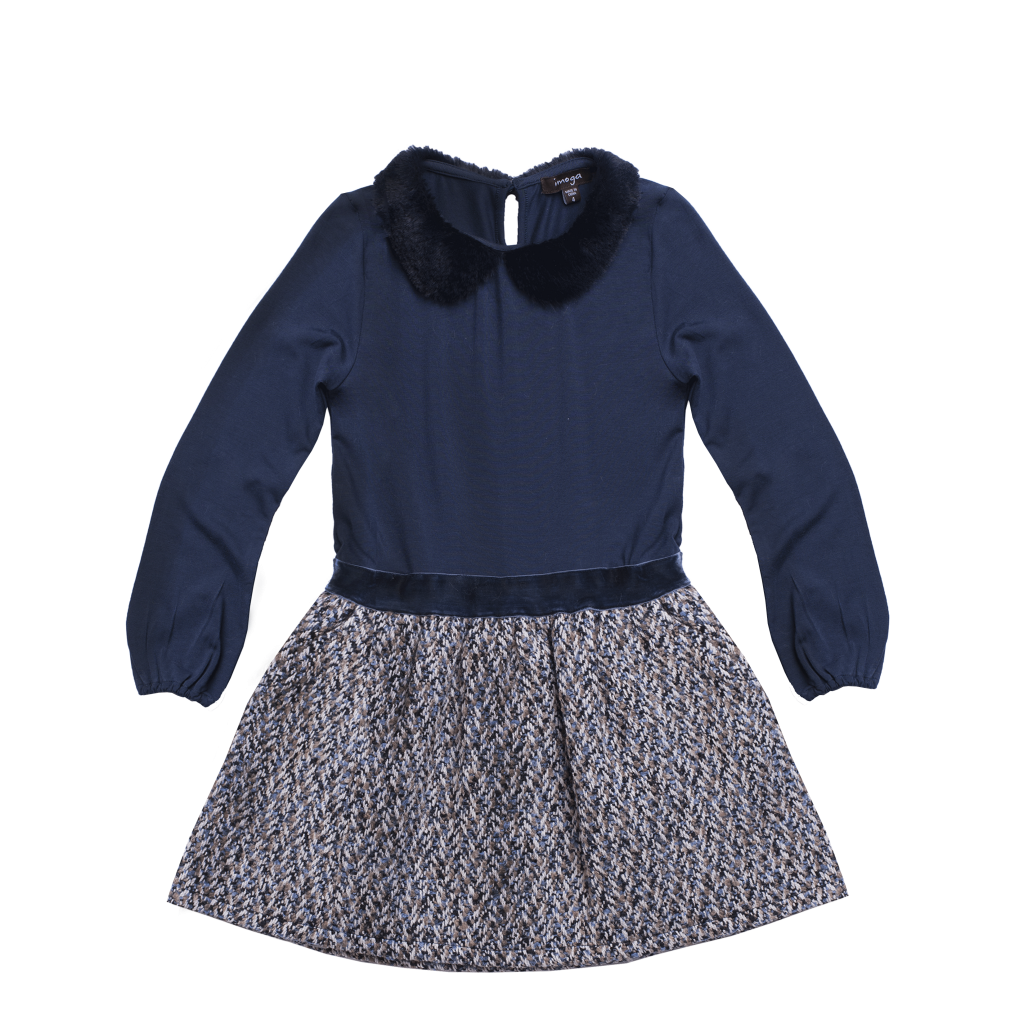 Featuring a long sleeve dress by Imoga with a viscose jersey top, faux fur collar, velvet trim and tweed skirt.