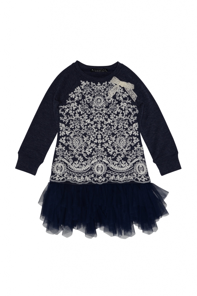 Comfy as her favorite sweatshirt, but pretty enough for a party, this versatile french terry dress is covered in a bloom of ivory embroidery and sports a twirly skirt made of netting petals.