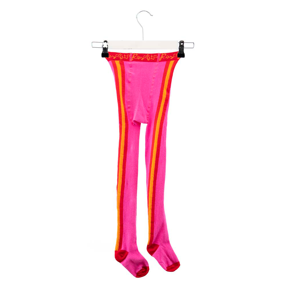 Fuchsia pink tights with stripes on the sides in red and orange tones.