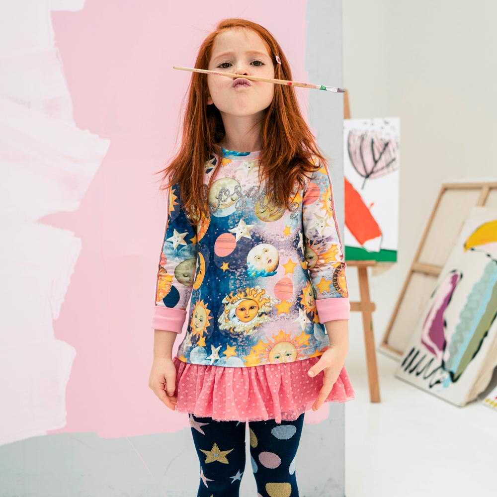 Pink dress features a print of stars, suns and moons in pastel tones. There is a ribbon detail on the sleeves, pink cuffs and tulle on the hem.
